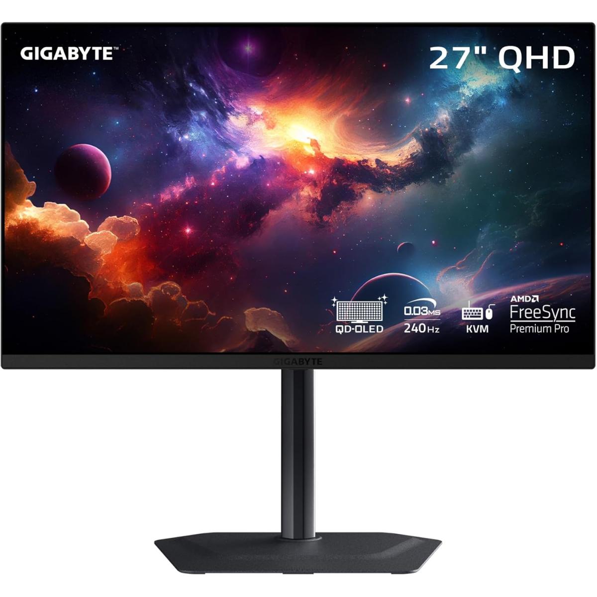 Gigabyte Mo27q2 27” Qd Oled Gaming Monitor Qhd 2k 240hz 0.03ms Gtg Amd Freesync Premium Pro Type C Kvm Hdmi, Dp, Type C W/ Height Adjustable & Speakers Black