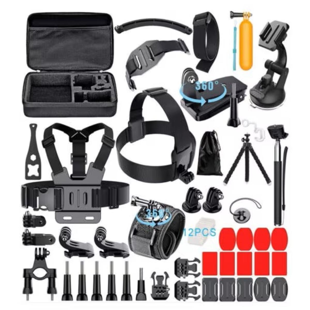 Maximize your GoPro’s capabilities with the 59 in 1 GoPro Accessories Kit . This comprehensive bundle includes everything you need for every shooting scenario, from underwater adventures to mountain biking, vlogging, and more. Compatible with all GoPro versions, from Hero 1 to the latest models. What’s Included Head Strap – Perfect for capturing hands-free footage from your point of view. B Model Chest Strap – Ideal for immersive action shots. Monopod Selfie Stick – Extendable for wide-angle selfies and group shots. Insurance Clap with 3M Sticker (GP21) – Ensures your GoPro stays secure. Sponge Flexible Tripod – Versatile and stable, can be mounted anywhere. Collecting Bag – Keeps all your accessories organized and portable. Curved and Flat Adhesive Mount with 3M Sticker (14pcs) – Reliable mounts for different surfaces. Anti-fog Inserts (12pcs) – Prevents lens fogging during cold or humid conditions. Vented Helmet Strap Mount (GP04) – Securely attaches your GoPro to your helmet. Buckle Basic Mount (GP06) (3pcs) – Quick release buckles for easy camera attachment. Plastic Spanner – Handy tool for tightening screws. Locking Plug – Ensures stability of your GoPro in extreme conditions. 360-degree Rotation Clip + Screw (GP137) – Allows for versatile mounting angles. Floaty Bobber with Strap & Screw (GP82) – Keeps your GoPro afloat in water. J-Hook Buckle Mount (2pcs) – Easy to attach and adjust. 360-degree Rotation Wrist Mount with Screw – For dynamic wrist-mounted shots. Helmet Curved Extension Arm Selfie – Great for extended helmet views. Hook and Loop Fastener Hand Strap – Keeps your GoPro securely in hand. Handlebar Seatpost Mount (GP02) – Perfect for cycling and motorcycling footage. Suction Cup – Strong and reliable, ideal for car mounts. Adapters (2pcs) – Connects different mounts seamlessly. Long Screw (4pcs) – Ensures all mounts and accessories are securely attached. Perfect for Every Adventure Whether you’re a professional filmmaker or an adventure enthusiast, this kit provides everything you need to capture stunning footage. From underwater dives to high-speed bike rides, every accessory ensures your GoPro is ready for action. Plus, it is compatible with all GoPro versions, ensuring versatility and ease of use. Why Choose Our 59 in 1 GoPro Accessories Kit? Versatility : Suitable for a wide range of activities and shooting scenarios. Compatibility : Works with all GoPro versions, from Hero 1 to the latest models. Durability : Made from high-quality materials for long-lasting use. Portability : The included collecting bag makes it easy to carry all accessories. Ease of Use : Designed for quick setup and secure mounting.