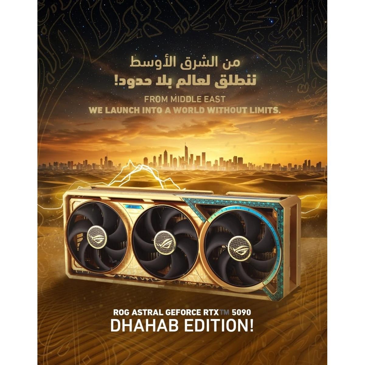 Asus Rog Astral Geforce Rtx 5090 Dhahab Oc Edition From Sands To Skies The Rog Astral Geforce Rtx™ 5090 Dhahab Edition Is A Celebration Of The Rapid Evolution Of The Middle East, Featuring A Unique Skyline Silhouette That Signifies A Transition From The Sands To The Skies. It Also Introduces Rog’s First Quad Fan Design, Coupled With A Patented Vapor Chamber, Increased Heatsink Fin Density, A Phase Change Gpu Thermal Pad, Towering Default Clock Speeds, Boosted Power Delivery, And More. These Premium Innovations – Amplified By An Eye Catching Die Cast Frame And Metal Gpu Bracket – Combine To Deliver Absolute Performance That Can Handle Even The Most Demanding Gaming Scenarios. Timeless Treasure The Rog Astral Geforce Rtx™ 5090 Dhahab Edition Boasts 6.5g Of 999 Fineness Gold Plating. This Opulent Detail Underscores Its Value As A High End Colleor’s Item. Modern X Heritage The Rog Astral Dhahab Edition Blends Modern Technology And Cultural Heritage, Refleing The Rapid Growth Of The Middle East. Arabic Calligraphy Timeless Calligraphy Communicates Three Core Pillars Of The Middle East: Strength, Courage And Unity. Skyscrapers Images Of Far Reaching Skyscrapers Illustrate The Strength Of Contemporary Middle East. Cooling Expertise Quad Fan Force A Revolutionary Four Fan Design Creates A Powerful Vertical Airflow Channel That Boosts Air Pressure By Up To 20%. This Results In Premium Thermal Performance That Dramatically Lowers Gpu Temperatures And Minimizes Hotspots, Enabling Unprecedented Clock Speeds. Optimized Fin Spacing The Addition Of A Fourth Fan Permits More Densely Packed Heatsink Fins, Increasing Cooling Potential. Patented Vapor Chamber A Patented Vapor Chamber With Milled Pathways Enables Heatpipes To Pass Through Without Needing To Have A Flattened Design , Boosting Heat Dissipation Efficiency. This Innovative Combo Maximizes Conta Surface And Improves Thermal Performance By More Than 10%. Maxconta Design Maxconta Is An Asus Exclusive Manufauring Technique That Effeively Increases The Surface Area Of The Gpu Heat Spreader By 5% For Improved Thermal Efficiency. Phase Change Gpu Thermal Pad By Melting To Effeively Fill The Gaps Between The Gpu And The Thermal Module, A Premium Phase Change Gpu Thermal Pad Provides Superior Thermal Conduivity And Enhanced Heat Dissipation, Ensuring Optimal Performance And Longevity For Graphics Cards Under Heavy Loads. Premium Power Delivery Unmatched Reliability Powerful 80 Amp Mosfets Deliver Over 35% More Headroom Than The Standard Design. This Helps Ensure Enhanced Performance, Stability And Higher Overclocking Potential. Asus Gpu Guard & Bracket Asus Gpu Guard Applies Adhesive To Secure All Four Corners To Reduce The Risk Of Cracks, While A Gpu Bracket Helps Ensure Uniform Mounting Pressure And Extra Stability. Proteive Pcb Coating A Proteive Conformal Coating Envelops The Circuit Board To Help Prote Against Short Circuits Caused By Moisture, Dust Or Debris. Auto−extreme Technology An Automated Manufauring Process That Sets New Standards In The Industry By Allowing All Soldering To Be Completed In A Single Pass, Asus Auto Extreme Technology Reduces Thermal Strain On Components And Avoids The Use Of Harsh Cleaning Chemicals, Resulting In Less Environmental Impa, Lower Manufauring Power Consumption And A More Reliable Produ Overall. Gpu Tweak Iii: Effortless Gpu Monitoring And Tuning Effortless Overclocking Gpu Tweak Iii Lets You Effortlessly Fine Tune Overclocking Settings To Achieve Peak Performance. It Includes Oc Mode & Silent Mode Toggles, An Oc Scanner And A Voltage Frequency Tuner For Precise Adjustments. Thermal Map Embedded Sensors Across The Vrms, Chokes And Memories Colle Data In The Thermal Map, Empowering You To Check Real Time Temperatures In Each Area And To Easily Adjust System Settings For Optimized Performance. Power Deteor+ Power Deteor+ Can Dete Anomalies Across Any Of The Six Power Pins From The 12vhpwr Cable. If A Fault Is Deteed, You’ll Be Notified Immediately To Reseat The Power Cable Accordingly. Mileage The Mileage Feature Tracks Usage At Different Power Levels, So You Can Keep An Eye On What Kind Of Load You Have Used Across Multiple Game Sessions. Software With Indire Aura Argb Lighting, The Rog Astral Geforce Rtx 5080 Provides Endless Possibilities For Personalization With Color Or Funional Effes. Use It With Other Aura Components To Create A Uniquely Grow Your Dreams With Ai Magic Musetree Is An Ai Powered Image Generation App Designed To Spark Your Creativity. Effortlessly Create And Manage Images And Visual Ideas, Unlocking Endless New Inspirations. With Its Intuitive Visual Interface, Generating Stunning Images Has Never Been Easier! Features And Benefits The Ultimate In Ray Tracing And Ai Nvidia Rtx Is The Most Advanced Platform For Full Ray Tracing And Neural Rendering Technologies That Are Revolutionizing The Ways We Play And Create. Over 700 Games And Applications Use Rtx To Deliver Realistic Graphics And Incredibly Fast Performance With Cutting Edge Ai Features Like Dlss Multi Frame Generation. Supreme Speed. Superior Visuals. Powered By Ai. Nvidia Dlss Is A Revolutionary Suite Of Neural Rendering Technologies That Uses Ai To Boost Fps, Reduce Latency, And Improve Image Quality. Dlss 4 Brings New Multi Frame Generation And Enhanced Ray Reconstruion And Super Resolution, Powered By Geforce Rtx 50 Series Gpus And Fifth Gen Tensor Cores. Game Changing Realism Powered By The Nvidia Blackwell Architeure, Geforce Rtx 50 Series Gpus Unlock The Game Changing Realism Of Full Ray Tracing. Experience Cinematic Quality Visuals At Unprecedented Speed With Fourth Gen Rt Cores And Breakthrough Neural Rendering Technologies Accelerated With Fifth Gen Tensor Cores. Nvidia Powers The World’s Ai. And Yours. Upgrade To Advanced Ai With Nvidia Geforce Rtx Gpus And Accelerate Your Gaming, Creating, Produivity, And Development. Thanks To Built In Ai Processors, You Get World Leading Ai Technology Powering Your Windo