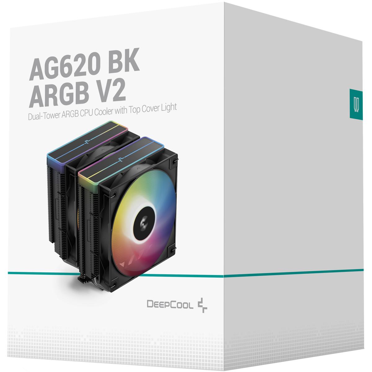 Ag620 Bk Argb V2 Power Meets Glow The Deepcool Ag620 Bk Argb V2 Is An All Black Dual Tower Cpu Cooler Focused On High Performance Efficiency Boasting Six Heat Pipes Packed In The Dense Heat Sink Tower For Optimal Heat Dissipation And Paired With Two Fine Tuned 120mm Argb Pwm Fans For Powerful Cooling. Brilliance In Design Deepcool's Recognizable Matrix Fin Stack Design Is Finished In A Dark Black Coating And Provides An Excellent Cost To Value Ratio. Paired With A Unique Argb Top Cover And A Minimalist Translucent Logo Design, Ag620 Bk Argb V2 Provides An Unprecedented And Unique Lighting Effe. Substantial Cooling Power An Upgrade To Deepcool's Newest Core Touch Technology 2.0 Dramatically Improves Cooling Capacity. The Heatpipes Have Been Optimized And Laid Out To Promote The Best Possible Thermal Transfer Through The Nickel Plated Coldplate From The Cpu Ihs. As A Result, t 2.0 Provides A Bump In Cooling Performance. Balanced Bidireional Heat Pipe Technology By Optimizing The Internal Capillary Struure And Injeing A Precise Amount Of Liquid, The Heat Pipe Achieves The Best Heat Dissipation Performance Regardless Of Whether The Cooler Is In A Vertical Or Horizontal Case. This Perfe Ratio Facilitates A Highly Efficient Phase Change Throughout The Heat Pipe And Achieves Lower Thermal Resistance Over A Wide Tdp Range. Bright, Quiet, And Capable Get The Best Of Both Worlds With Two Fine Tuned 120mm Argb Pwm Fans Designed For Optimal Balance In Top Performance Under Load To Silent Efficiency When Idle. Highly Effeive With Strong Static Pressure For Rapid Heat Transfer Throughout The Heat Sink. 300~1950 Rpm±10% Fan Speed 67.88 Cfm Airflow =29.4 Db(a) Noise Level Simple And Secure Installation The Provided All Metal Mounting Bracket Provides An Easy Installation Process That Ensures Proper Conta And Equal Pressure On Both Intel And Amd Platforms. Lga1851/1700/1200/115x Intel Am5/am4 Amd Your Name Your Review Note: Html Is Not Translated! Rating Bad Good Continue