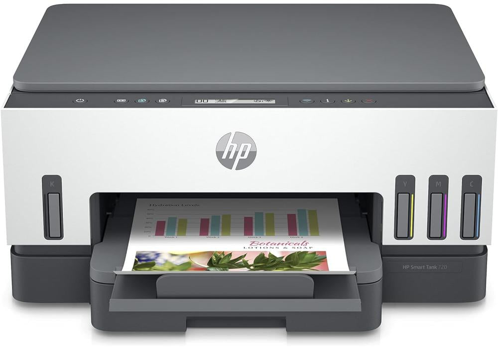 | Included components | HP Smart Tank 720 All-in-One, 3 x HP GT53XL 135-ml Black Original Ink Bottle, HP GT52 Cyan Original Ink Bottle, HP GT52 Magenta Original Ink Bottle, HP GT52 Yellow Original Ink Bottle, Power cord, HP Black color printhead, HP Tri color printhead, Setup guide, Reference guide, Ink caution flyer, Regulatory flyers, warranty flyers |